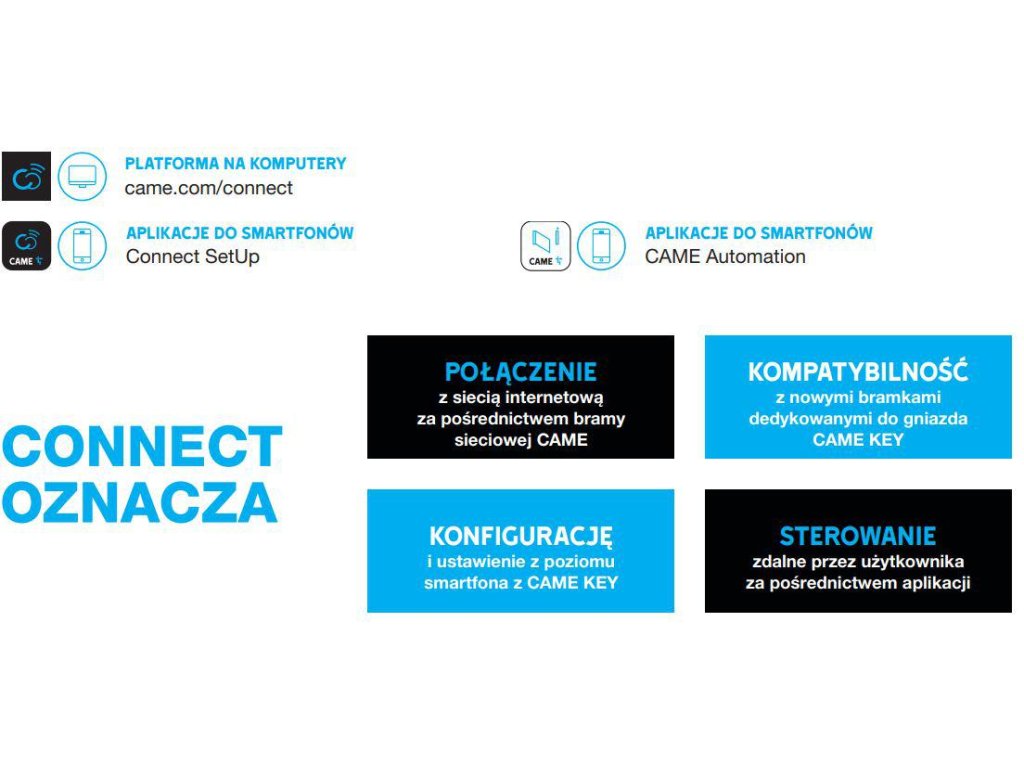 CONNECT je technologie společnosti CAME pro řízení automatizace, která zlepšuje kvalitu života jejich uživatelů. Automatizace připojené přes web představují přidanou hodnotu pro uživatele a instalatérovi otevírají nové obchodní obzory.