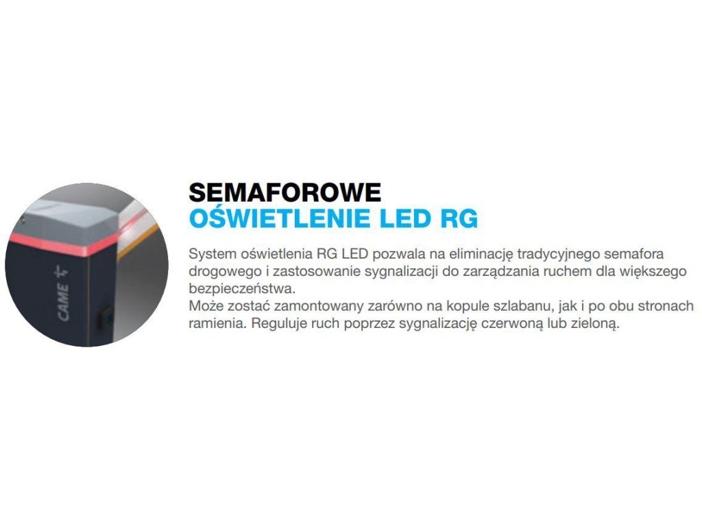 Systém osvětlení RG LED umožňuje odstranit tradiční dopravní semafory a používat signalizaci k řízení dopravy pro zvýšení bezpečnosti. Lze jej namontovat buď na kopuli závory, nebo na obě strany ramene. Regulace provozu pomocí červené nebo zelené signalizace (připojení přímo k ústředně bez nutnosti použití dalších relé)