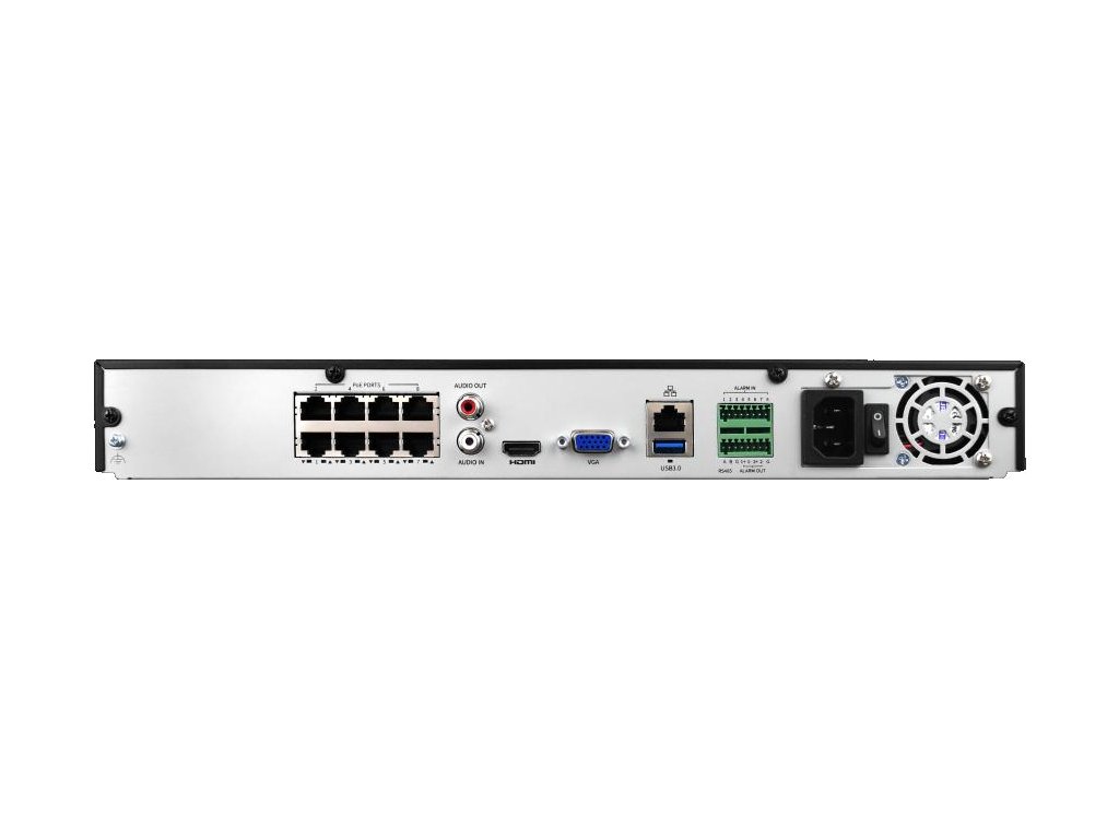 IP 8kanálový BCS Point DVR. Přizpůsobeno pro spolupráci s kamerami s rozlišením až 16 Mpx. Vestavěný 8portový přepínač PoE.
