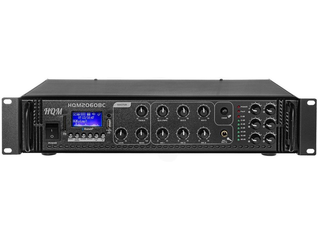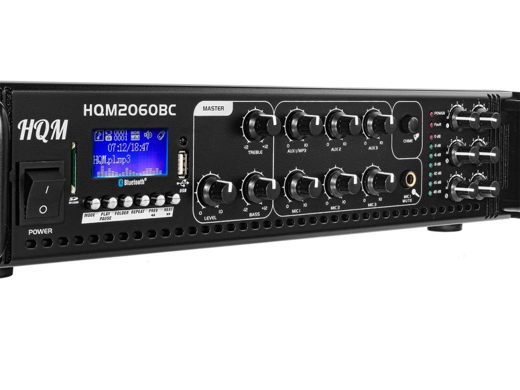 Profesionální zesilovač HQM2060 BC od společnosti High Quality Music byl navržen pro nerušené vysílání hudebních zvuků i hlasových oznámení. Přístroj má 3 mikrofonní vstupy s prioritou na prvním vstupu (MIC1) a 3 linkové vstupy. Zesilovač má systém nastavovacích bodů pro kalibraci hlasitosti, úrovně basů a výšek a hlasitosti připojeného zařízení.