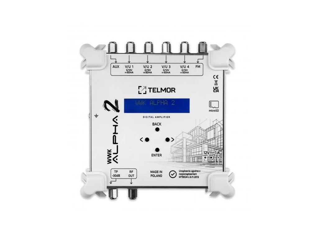 WWK ALPHA 2 je pokročilý digitální vícepásmový zesilovač určený pro profesionální instalace antén SMATV a rozsáhlé individuální instalace. Zařízení umožňuje selektivní zpracování signálů DVB-T/T2 v pásmech VHF a UHF, integraci signálů DAB a FM a také spolupráci s externími modulátory a hlavicemi prostřednictvím vstupu AUX.