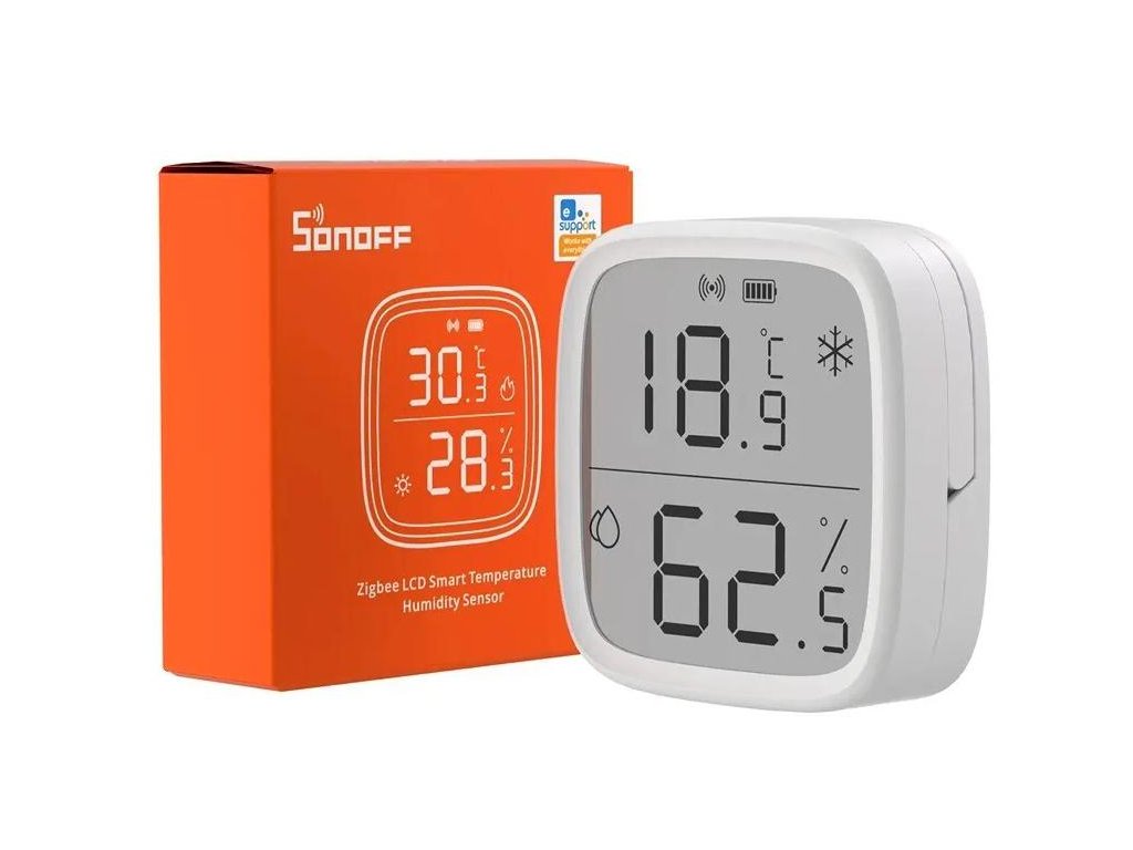 - Inteligentní čidlo teploty a vlhkosti s LCD displejem Sonoff SNZB-02D je zařízení, které nabízí ještě větší přesnost měření díky použití švýcarského hygrostatu vynikající kvality.