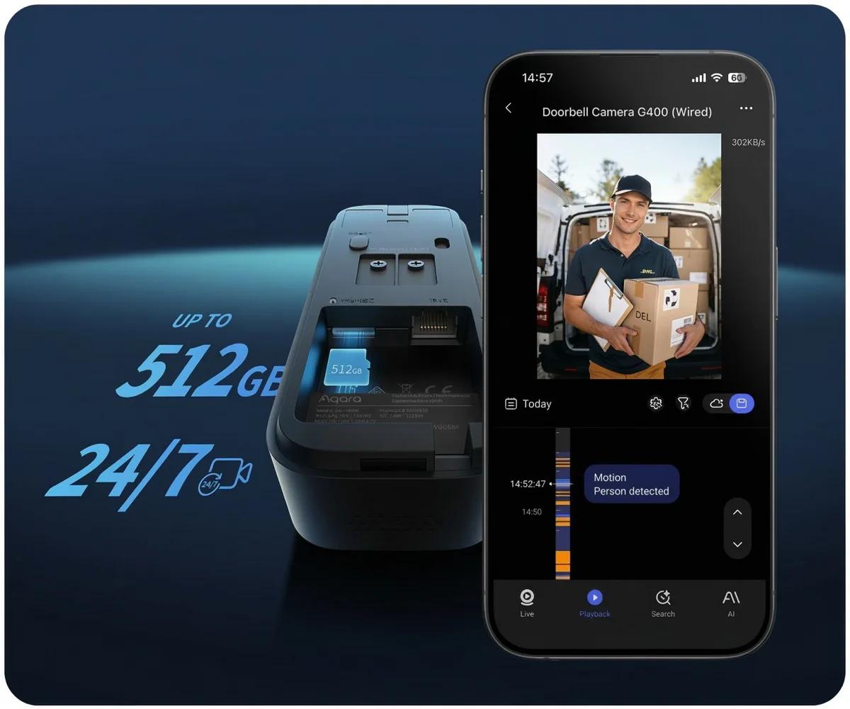 Na rozdíl od mnoha jiných systémů nabízí Aqara nepřetržitý záznam 24/7 na kartu microSD. Zařízení také podporuje automatické zálohování na server SMB NASkterá chrání vaše data i v případě krádeže interkomu. Získáte tak přístup k úplné historii událostí, aniž byste museli platit měsíční předplatné. Kromě toho je k dispozici tříměsíční plán HomeGuardian nabízí přístup k ještě pokročilejším analytickým funkcím.