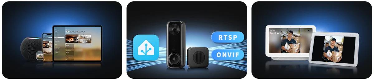 Produkt bezproblémově spolupracuje s platformami, jako je Apple HomeKit, Amazon Alexa nebo Google Home. Podpora Zabezpečené video HomeKit umožňuje bezpečně ukládat nahrávky na iCloud. Pokročilí uživatelé mohou využít podporu pro RTSP a ONVIF umožňuje připojení kamery k NVR nebo systémům Home Assistant. Díky tomu se videointerkom stává nedílnou součástí profesionální chytré domácnosti.